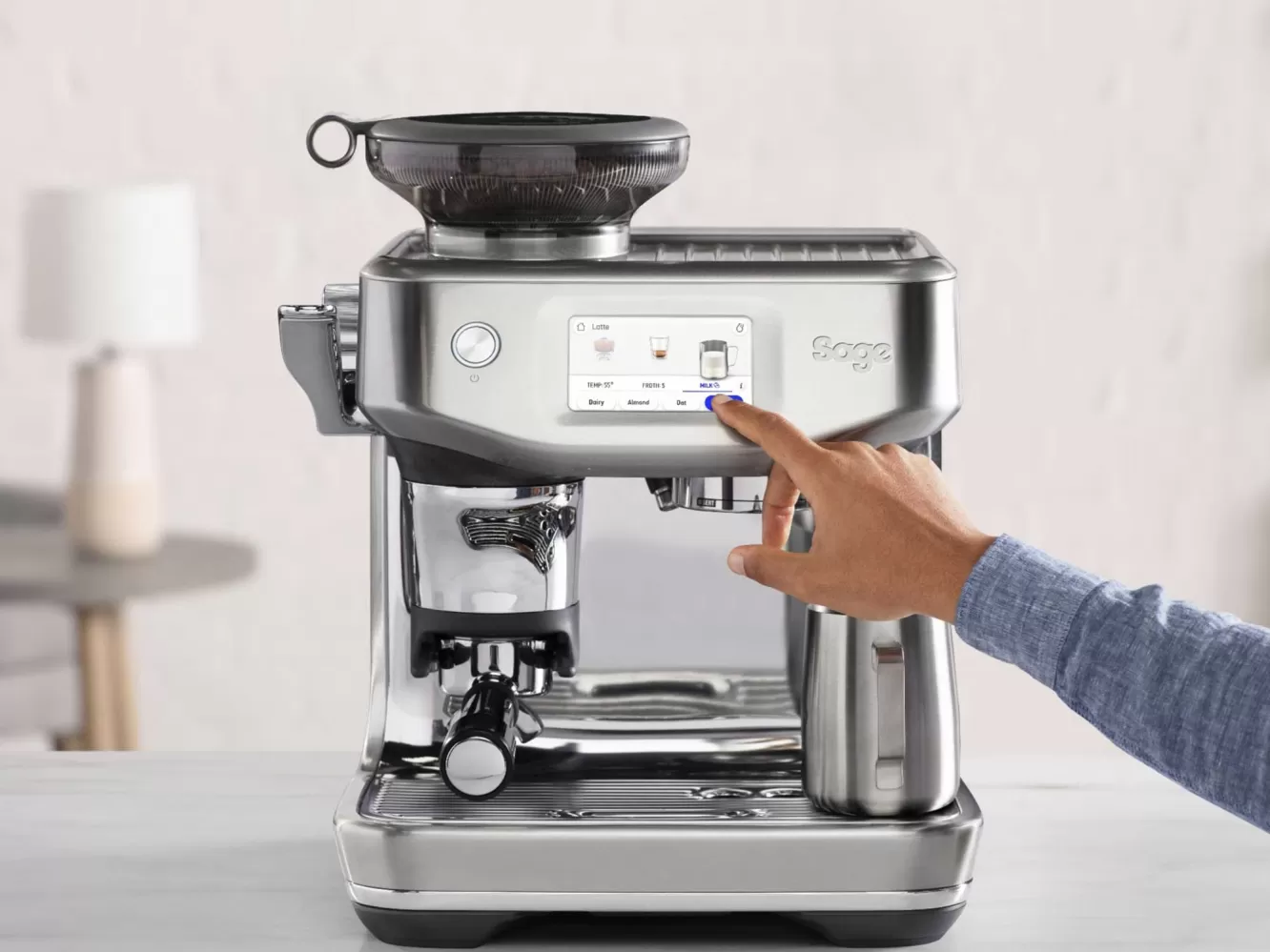 Espresso přístroj s dotykovým displejem a mlýnkem na kávu.